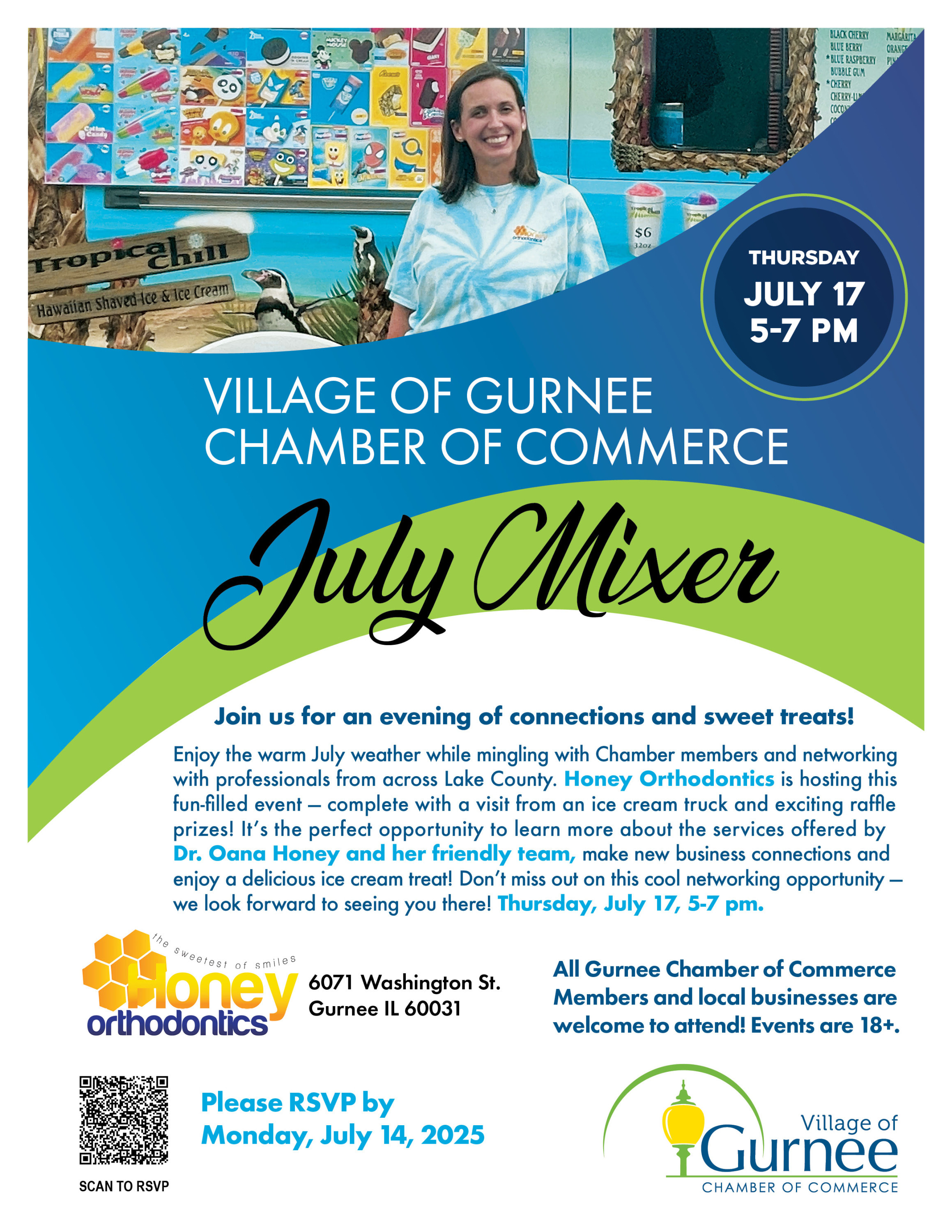 You're Invited: Cool Off and Connect at Honey Orthodontics! Enjoy the warm July weather while mingling with Chamber members and networking with professionals from across Lake County! Honey Orthodontics is thrilled to host this fun-filled summer event — featuring a visit from an ice cream truck and exciting raffle prizes! Join us for a casual evening where you’ll: Connect with local professionals and Chamber members Learn about the services offered by Dr. Oana Honey and her welcoming team Indulge in a sweet ice cream treat Enter to win exciting raffle prizes Thursday, July 17 5:00 – 7:00 PM at Honey Orthodontics, 6071 Washington St., Ste A. Don’t miss this cool networking opportunity — we look forward to seeing you there!